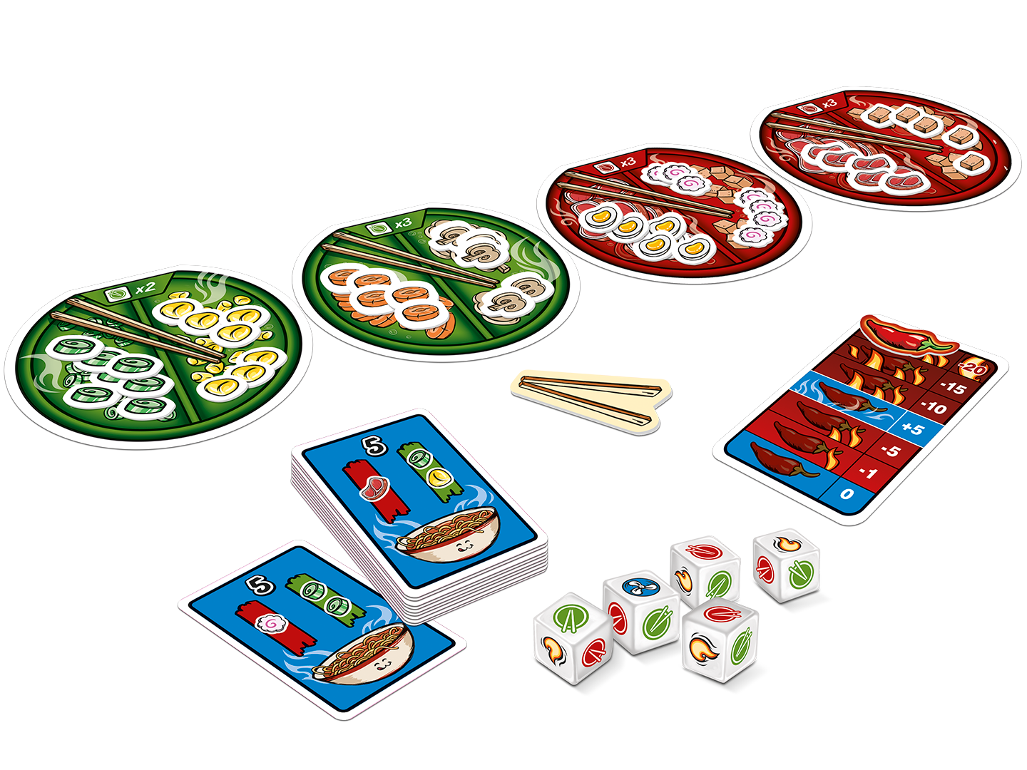 The heat is on! Ramen connoisseurs take turns rolling and re-rolling dice to purchase ingredients to compete for the best bowls of ramen! Players also put the heat on their opponents by raising their spice levels which decreases their points.