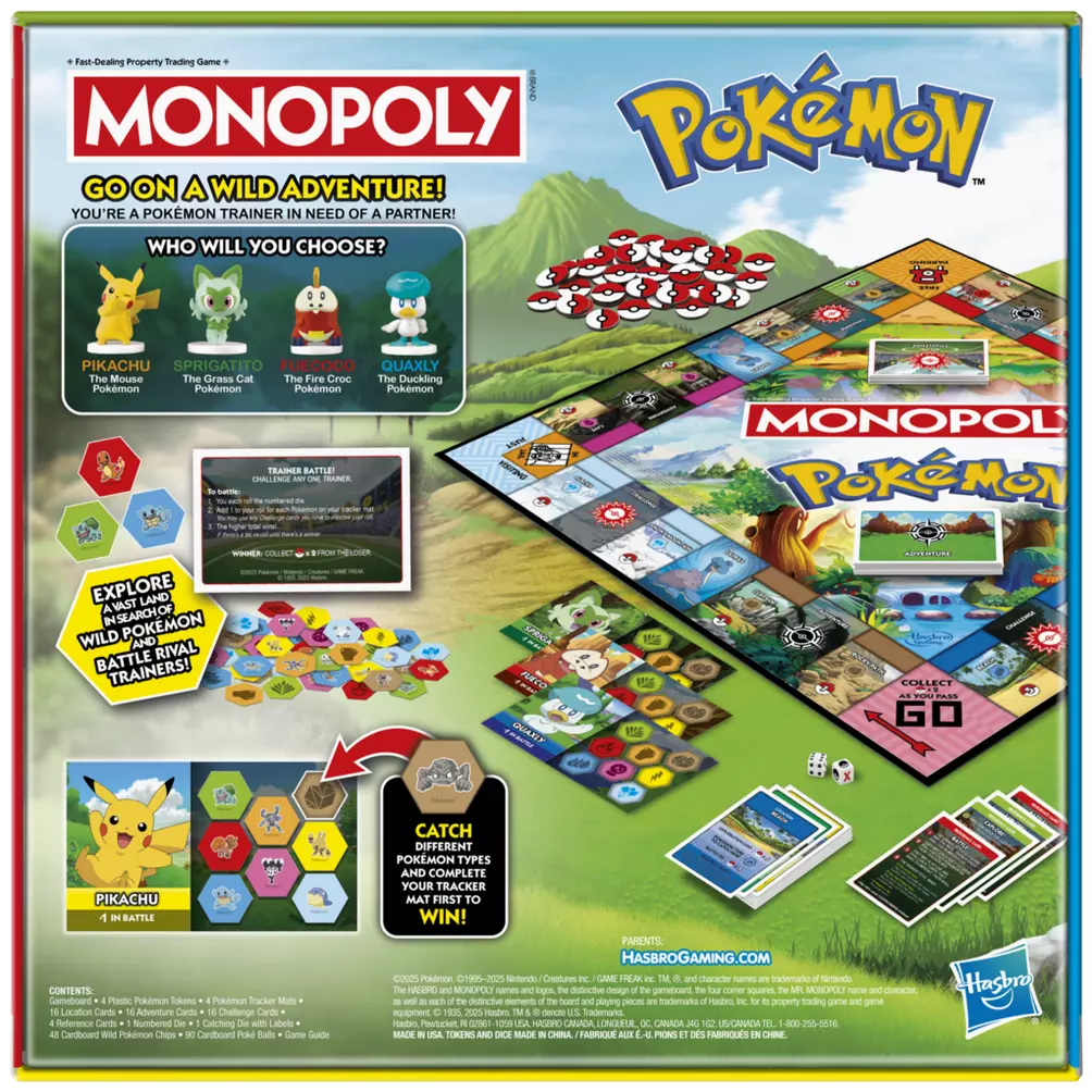 Race to catch the wild Pokémon! The Monopoly Pokémon Edition game combines classic Monopoly gameplay with thrilling Pokémon-catching action. Play as a Pokémon Trainer adventuring through a vast land with a Pokémon partner. In this fun kids game, Properties are vibrant locations and Poké Balls replace money. Players explore locations, catch different types of wild Pokémon to add to their tracker mat, and battle rival Trainers to collect Poké balls. Be the first Trainer to complete their tracker mat or the last Trainer with Poké balls to win! This Pokémon game is an engaging kids board game for Family Game Night, and it makes a great Pokémon gift for boys, girls, and kids ages 8 and up who are Pokémon fans and Monopoly board game fans
